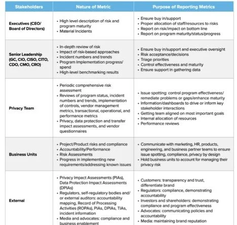 Figure 1: Table provided by the speakers in the PowerPoint presentation detailing the nature and purpose of privacy metrics depending on which stakeholder is your audience.